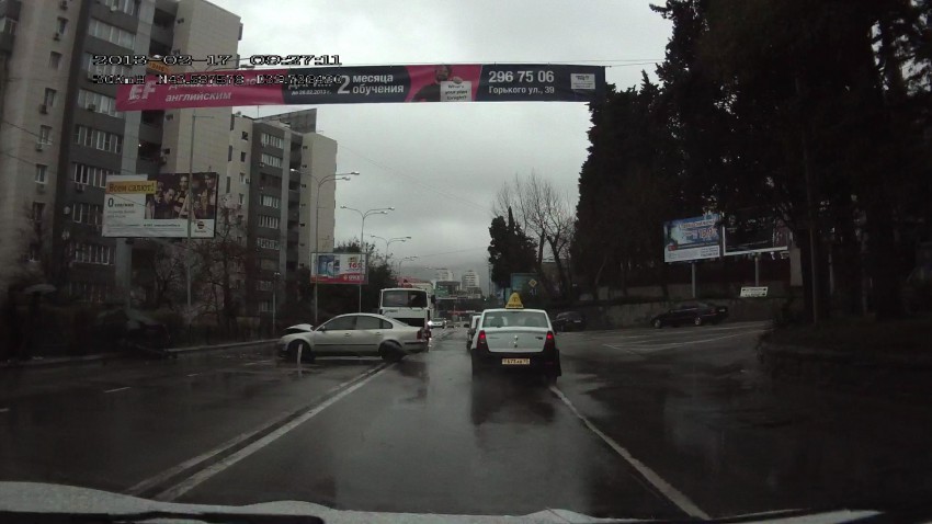 Авария на перекрестке Горького-Войкова. Столкнулись две иномарки, одна из них, пробив ограждение, вылетела на тротуар.
