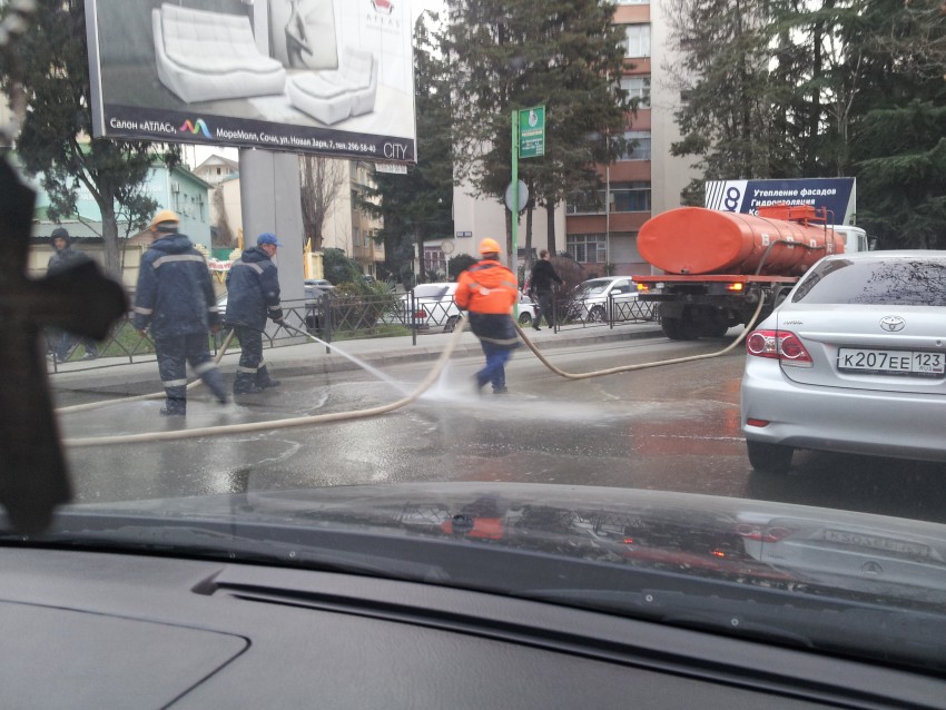 Сегодня утром люди мыли улицу.От «Спортивной» до «Кубанского кольца».