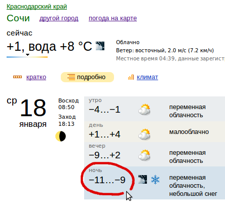 Прогноз от Яндекса на ближайшую ночь -11..-9