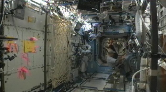 На космической станции.В серой майке, командир МКС 30 Даниэл Бёрбэнк, на заднем плане космонавт, бортинженер МКС 30 Анатолий Иванишин.
