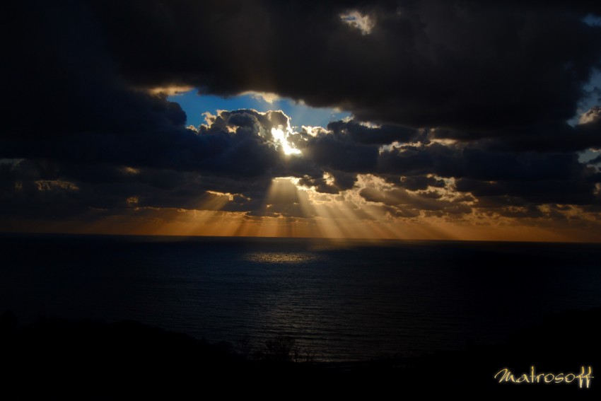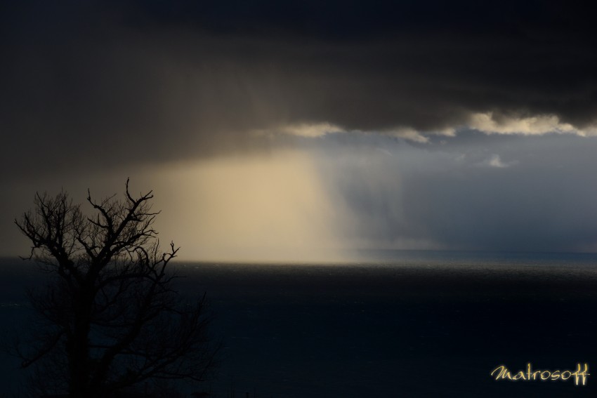 А вот так выглядит падающий в море снег под прямыми солнечными лучами заката