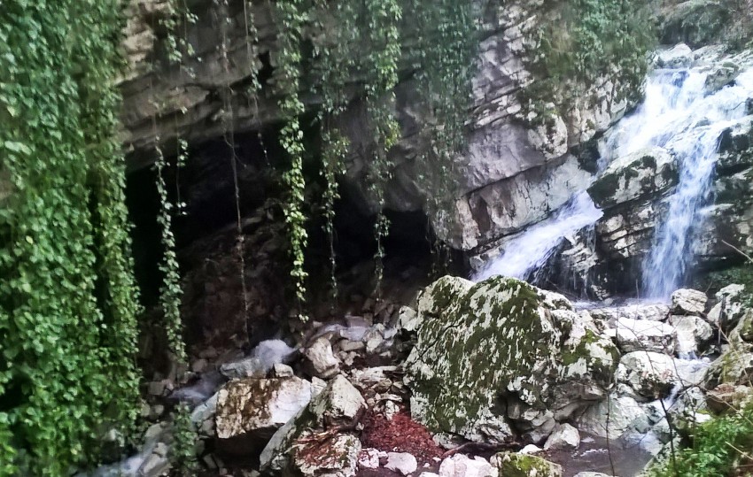 Довольно редкий вид — водопад у входа в Воронцовскую пещеру.