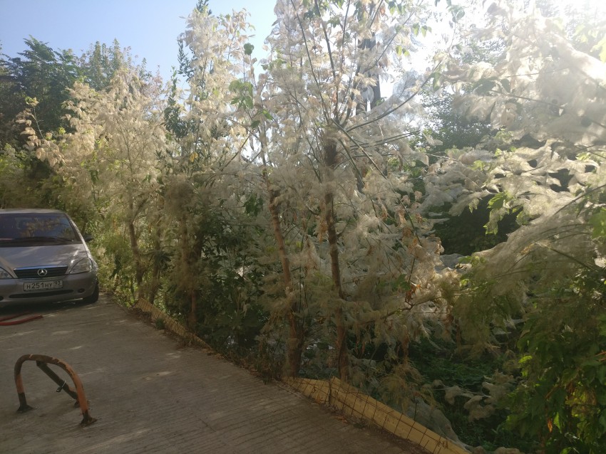 За одну ночь кусты во дворе полностью затянуло в паутину