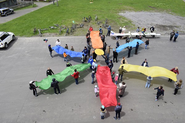 А у нас был флешмоб, в честь 70-летия образования Сахалинской области. Делали солнышко, символизирующее начало дня в России.