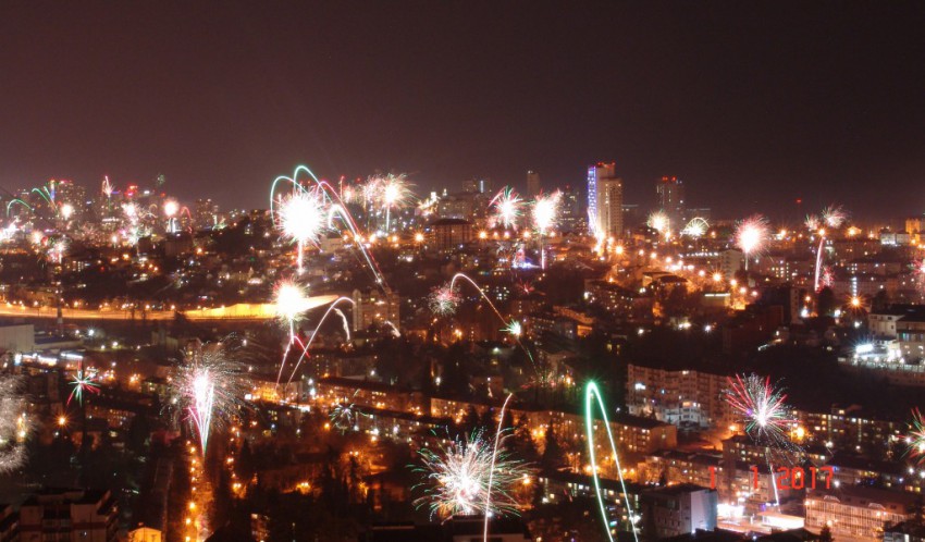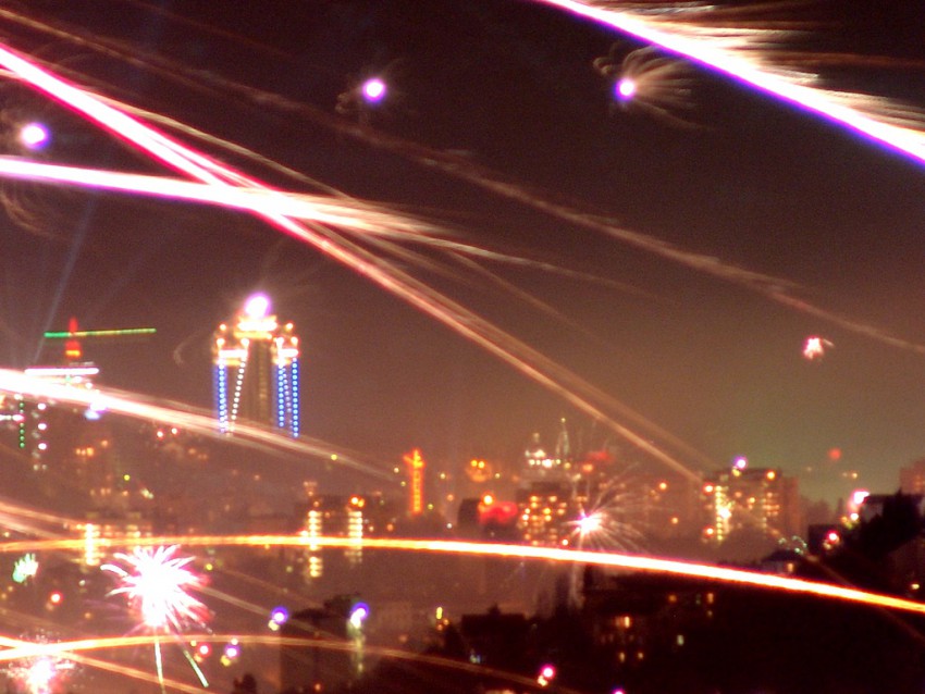 Первые минуты 2008 г. вид на город сквозь огни салюта