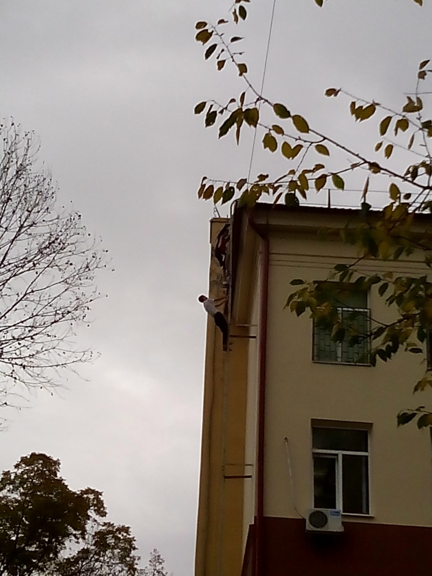 13 школа.Судя по одежде первого парня урок физ-ры.Где учитель? Парень всетаки влез на крышу второй спустился.