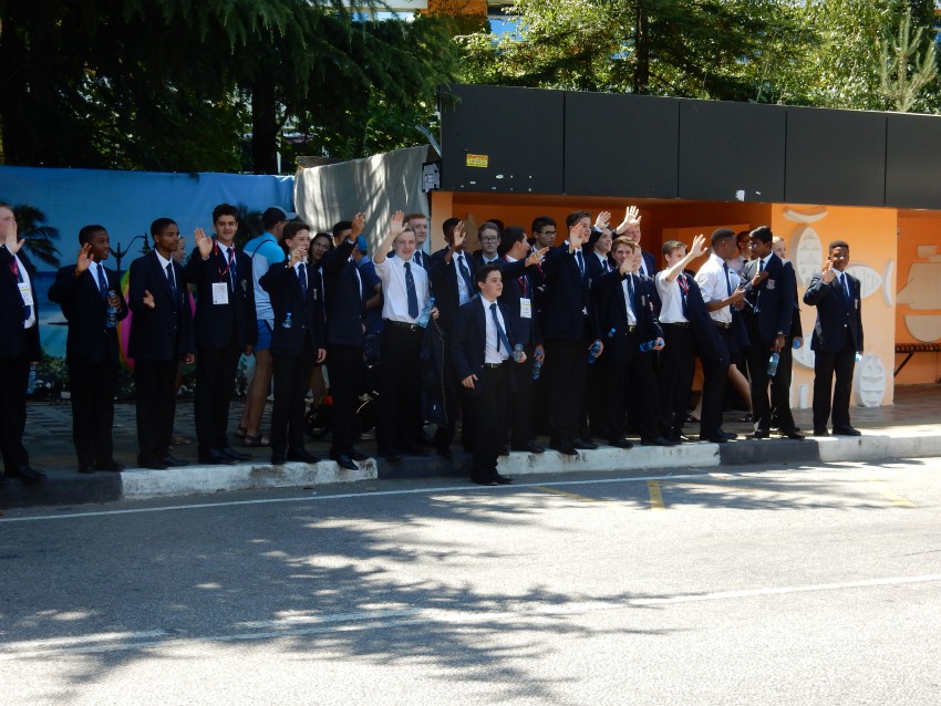 Делегация молодёжи на остановке «Южное взморье» радостно приветствует всех проезжающих. Мелочь, а приятно!