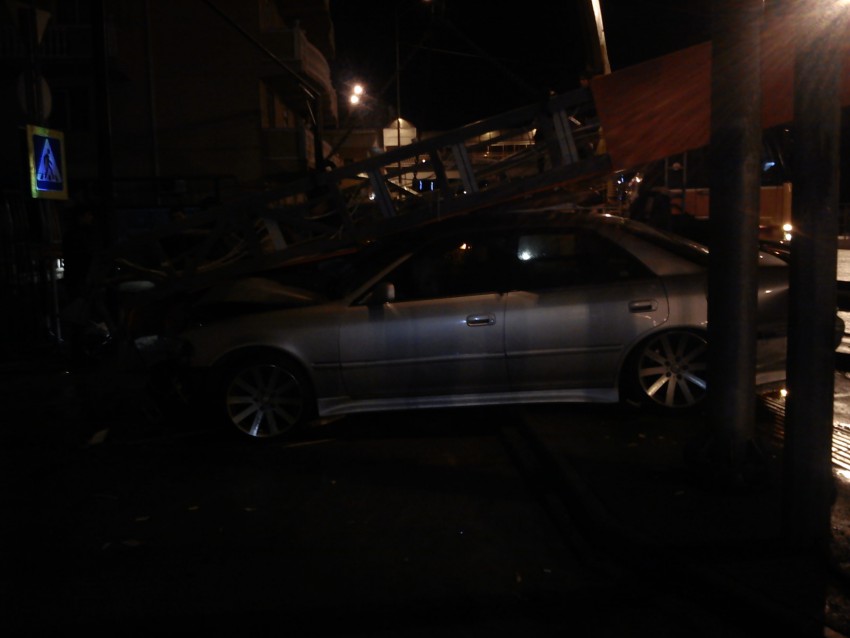 Авария возле ТЦ «Апельсин» Адлер, Тойота с дрифтовыми колесами снесла огромный указатель торгового центра. Выковыривали тойоту три часа.
