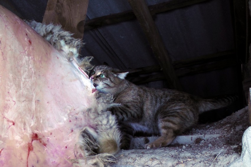 Рыся Пытается стащить свежесодранную шкуру барана…
