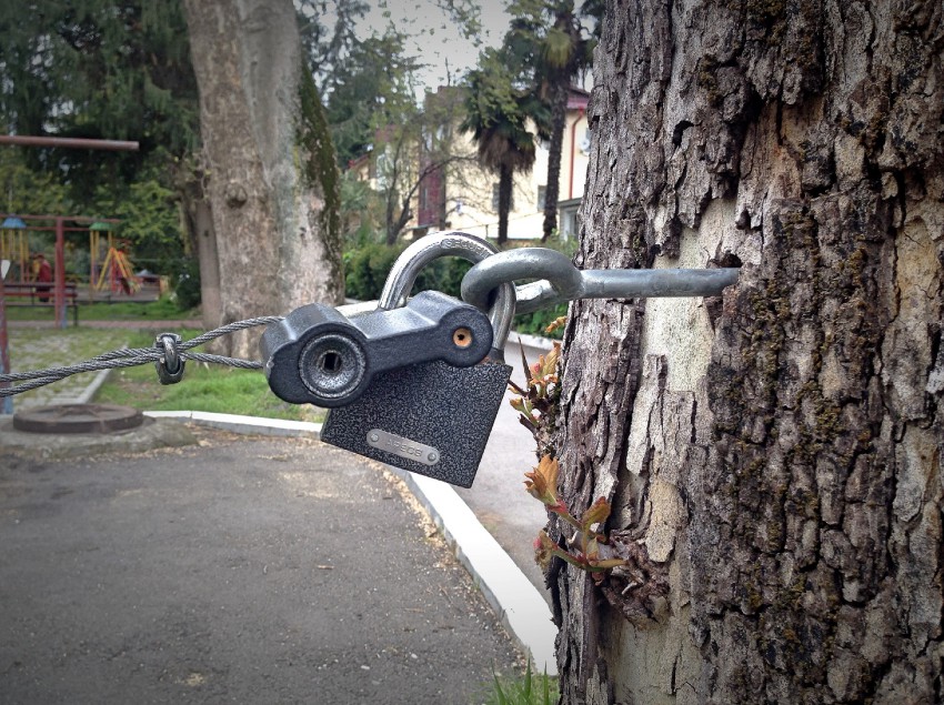 «Я у мамы ...!» Организаторы загражднеия внутридомовой парковки вкорячили его в ствол платана.