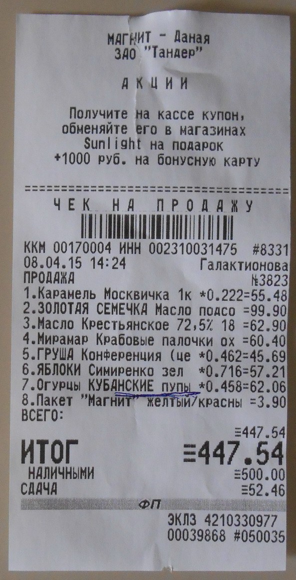Кубанцы или «Магнит» на ул. Южных ленивцев реально «опупели» -смотри чек, там написано. Масло «Золотая семечка»- почти 100 рублей.
