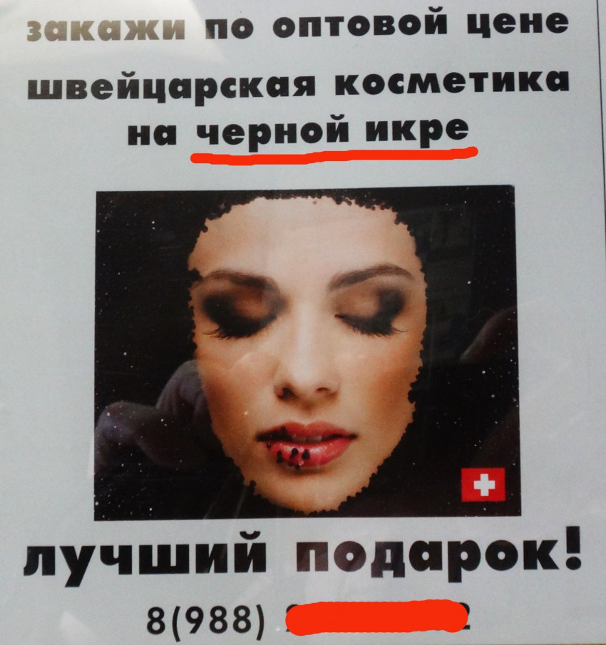 Из черной икры — этот для гламура, для тех, кто попроще — из селедки (реклама в лифте)