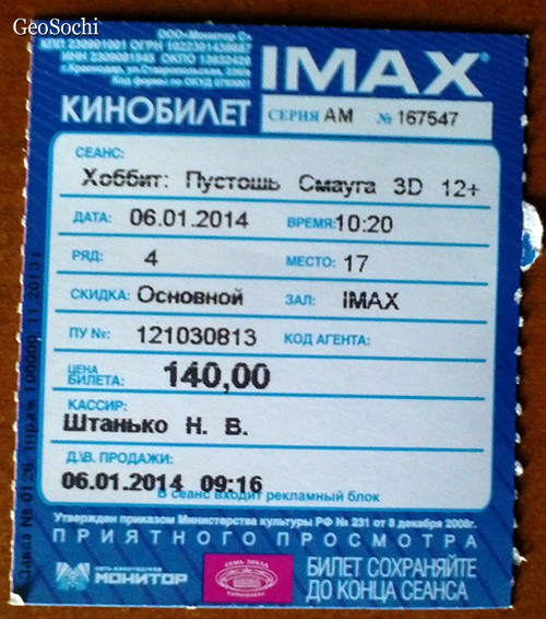 Хоббит, IMAX 3D 140 руб. Привет из Краснодара, от кинотеатра с самым большим экраном в стране, жадному сочинскому «Люксору» из Горемола.