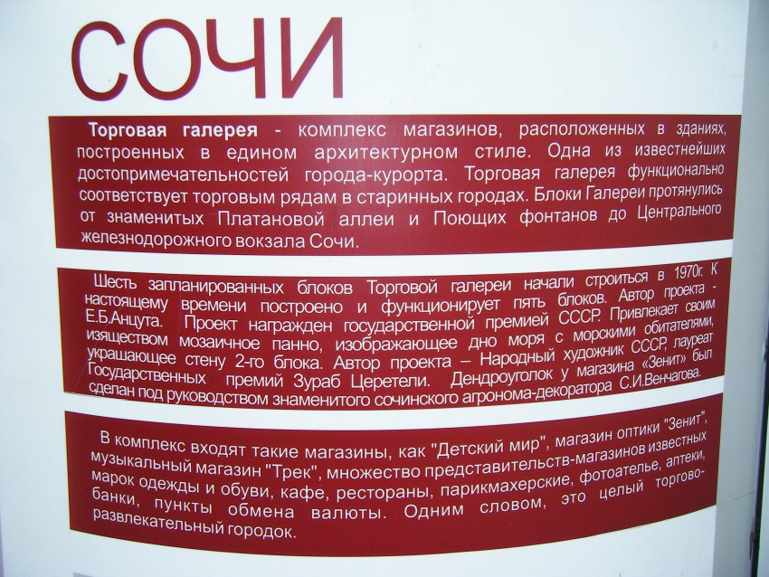 Извиняюсь за перекошенное фото))). Просто хотела напомнить сочинцам и гостям города, кто автор красивой мозаики на Торговой галереи. А то его всё больше ругают, но за эту работу его можно искренне поблагодарить.