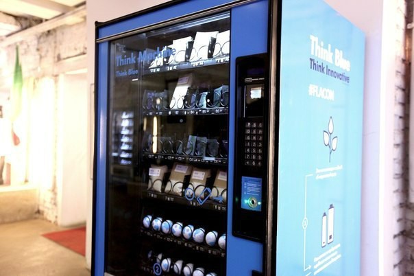 Аппарат принимает батарейки формата AA (пальчиковые) и AAA (мизинчиковые). В обмен на эковалюту автомат выдает футболки, скидочные карты дизайн-завода «Флакон» и антистрессовые мячики.