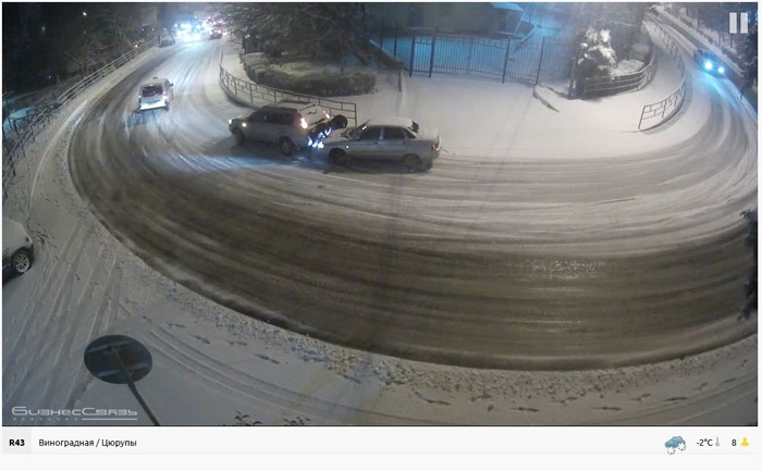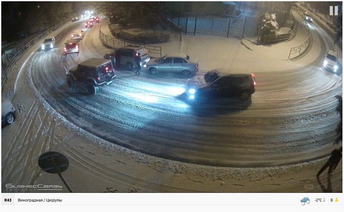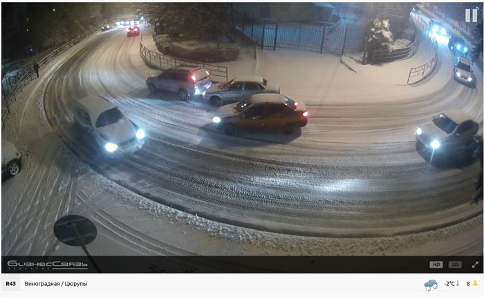 Вчера по камерам таких отчаянных несколько попадалось. Один даже на горку (камера «Выезд с Макаренко») — всё время двигаясь скользя по снегу расставленными ногами для сохранения устойчивости — прошёл, хотя многие авто не смогли. А на камере «Виноградная / Цюрупы» прям на глазах один догнал:
