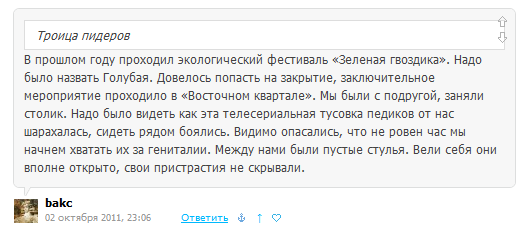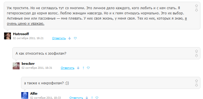 Очередное доказательство скудности твоего умишка. ну неужели не можешь придумать троллинг посерьезнее? Фантазия у вас там совсем иссякла? Только и умеете кивать, что на западе, мол, раздолье для гомосексуалистов. а сколько их в стране, сколько их среди тех, кому вы медальки раздаете? сколько их среди менеджеров и управленцев от ЕР? ты прекрасно знаешь сколько, я уверен. Только что-то принято у вас всех «согласных» не причислять к заднеприводным, хотя смотреть на них еще противнее, чем на гей-парады на том же западе. У самих же рожа крива, Мишаня))