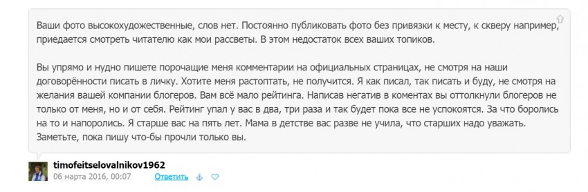 Написав негатив в коментах вы оттолкнули блогеров не только от меня, но и от себя. Рейтинг упал у вас в два, три раза и так будет пока все не успокоятся. За что боролись на то и напоролись.… Заметьте, пока пишу что-бы прочли только вы.