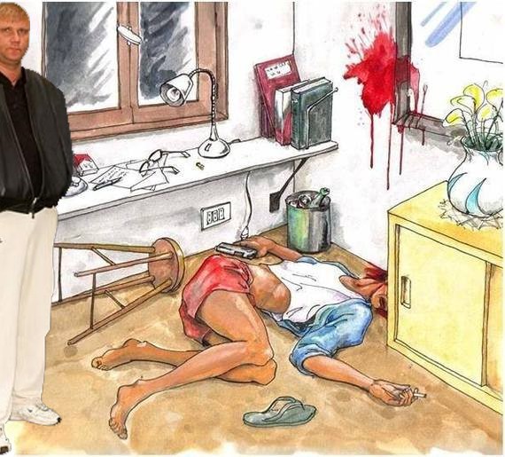 Это убийство, т. к. если бы это был суицид, то гильза не могла упасть на столик возле лампы. Гильза вылетает вверх и вправо. Кроме того стул лежит вплотную к стене и сидеть на нем потерпевший не мог, так как стол давил бы на голову. Значит этот стул туда кто-то задвинул.