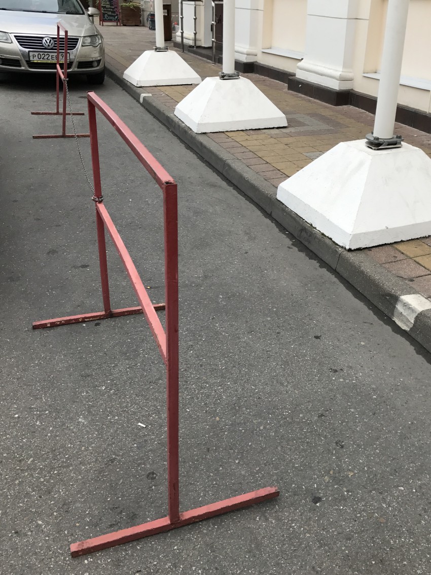 А в чем нарушение? Какую ту фигню с цепочкой выставили! Цепочка чтоб не сперли первую или вторую фиговину по отдельности, а с двумя бегать не удобно!))) Стакой же легкостью можно выставлять простую коробку! Законом не запрещено, и вам ни чего не мешает эту дрянь отодвинуть и занять место!)) Можно еще и спасибо кому нить сказать зато что место придержали!))