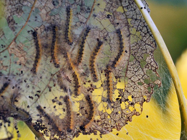 Бабочки появляются весной, в период цветения фруктовых деревьев. В мае-июне они активно откладывают яйца, а уже через пару недель из яиц появляются гусеницы, которые буквально за несколько часов пожирают лиственную часть дерева. Гусеницы живут колониями – это те самые «гнезда» из паутины, которые мы видим на пораженных вредителем деревьях. 40, а то и 50 дней гусеницы уничтожают все на своем пути, и только потом окукливаются. Уже в июле появляется следующее поколение бабочек, самки второго колена еще плодовитее: одна особь откладывает 2500 яиц! Гусеницы второго поколения объедают деревья до самой осени.