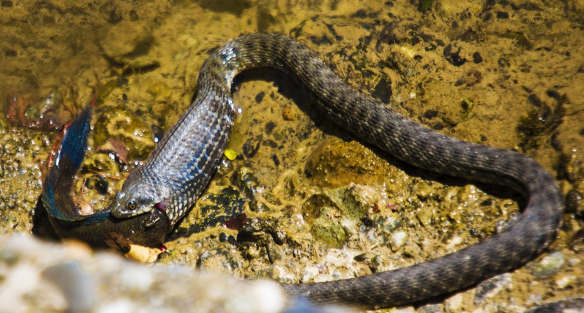 Я как-то наскочил в Аше на змеюку, которая схватила лягушку за лапу и не отпускала. Размеров змеюки не хватало чтобы лягушку проглотить, а у лягушки не хватало сил чтобы удрать. Так они и вошкались туда-сюда. И даже возле занятых зверушек не особо комфортно стоять была — мало ли, вдруг бросит лягушку и мной заинтересуется… так толком и не снял.
