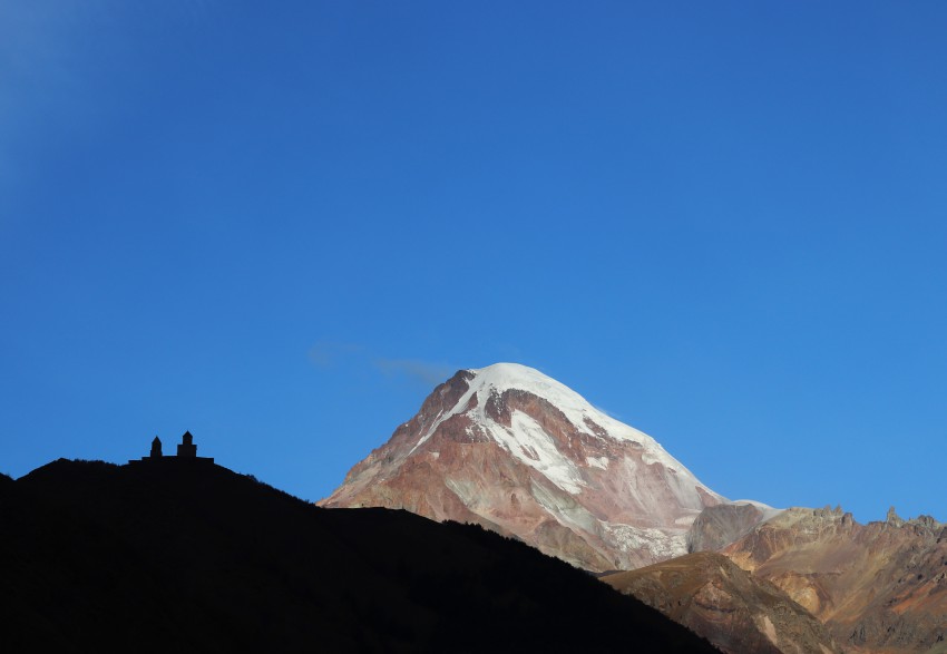 А вот такое фото у меня впервые получилось — монастырь в тени, а Казбек как на ладони. Октябрь 18 года.