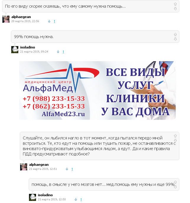 Слушайте, он лыбился нагло в тот момент, когда пытался передо мной встроиться. Те, кто едут на помощь или тушить пожар, не останавливаются с виновато-придурковатым улыбающимся лицом, а едут. Да и какие правила ПДД предусматривают подобное?
