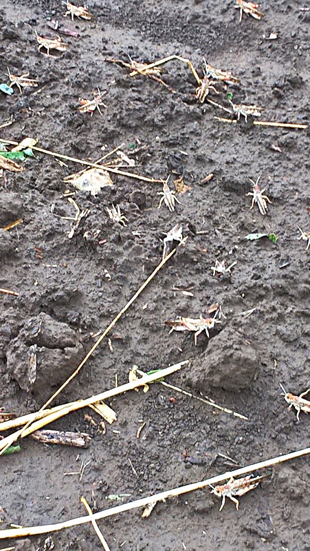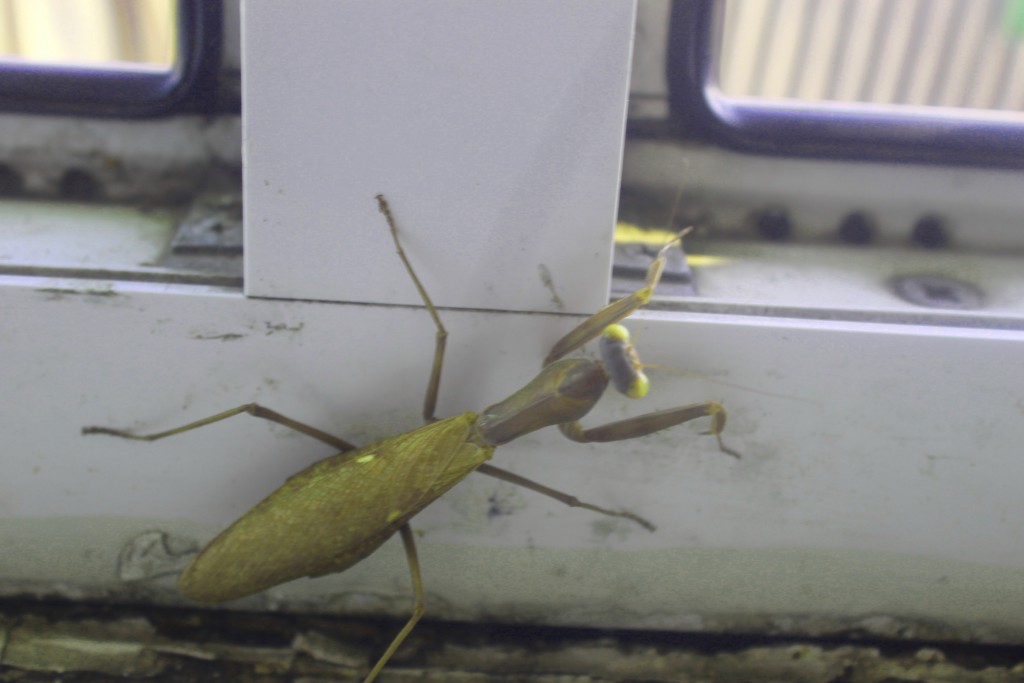 Ваши предположения неверны все. Кузнечик или саранча вполне живой, активно передвигался по стене, и цвет его именно такой, как в природе. Красить нет никакого смысла