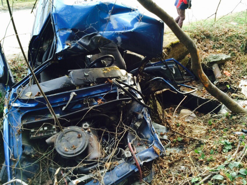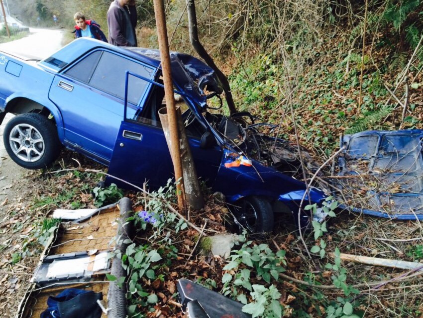 ИМХО удар был правым боком в очень крепкую забетонированную трубу. Там автобусная остановка, школа через дорогу и знак 20, но на спуске все его игнорят. Чего так занесло, может ночью лёд был?