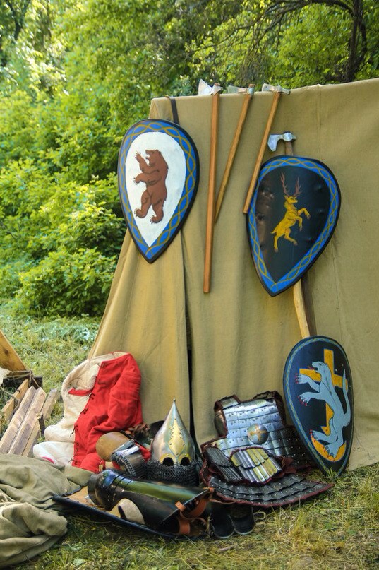 Доспехи обычно покупаем у мастеров, а одежду в большинстве шьем сами. Все должно соответствовать той эпохе, которую собираешься реконструировать. Ничего нельзя брать из других эпох, например на фестиваль 12-13века нельзя надевать что-либо из 14 или 9 века, и тем более что-то придумывать от себя.