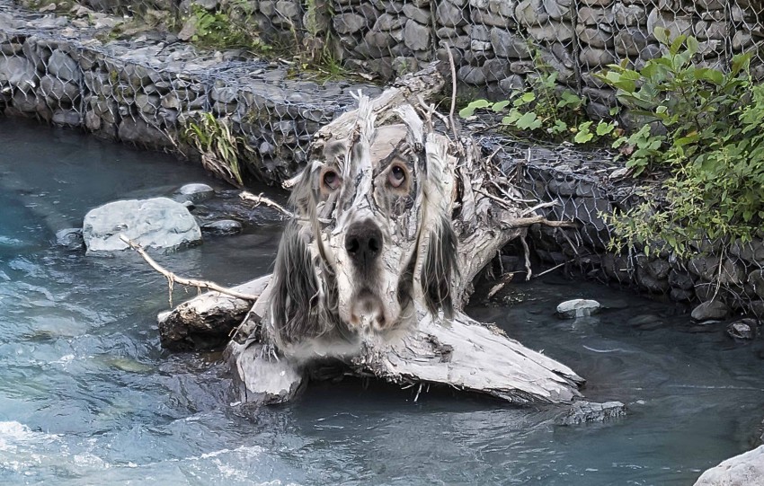 Извините, я неправильно написал в заголовке. Специально для Вас: никакой собаки там нет. Камни и древесина расположены так, что издалека в этой куче можно рассмотреть очертания, схожие по форме с головой собаки или другого зверя. Однако это не живое существо и живым никогда не было.