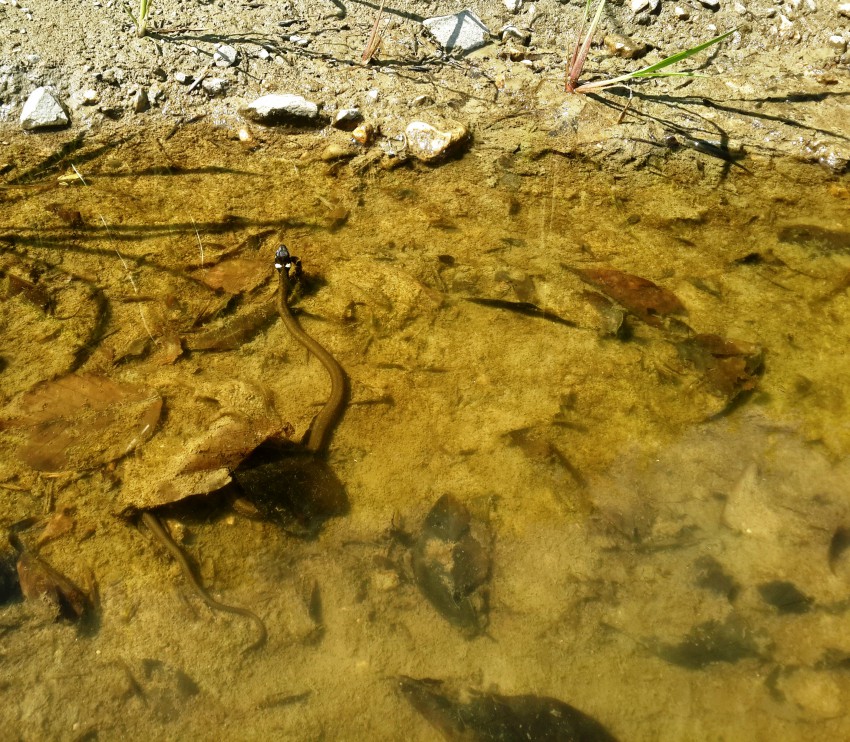 Это водяной ужик. Охотится в основном в воде на мальков рыб. Подолгу скрывается на дне меж коряг и камней. При такой жизни желтые пятнышки только выдавать будут. Вот и приходится ему в тон водички и дна речного маскироваться.
