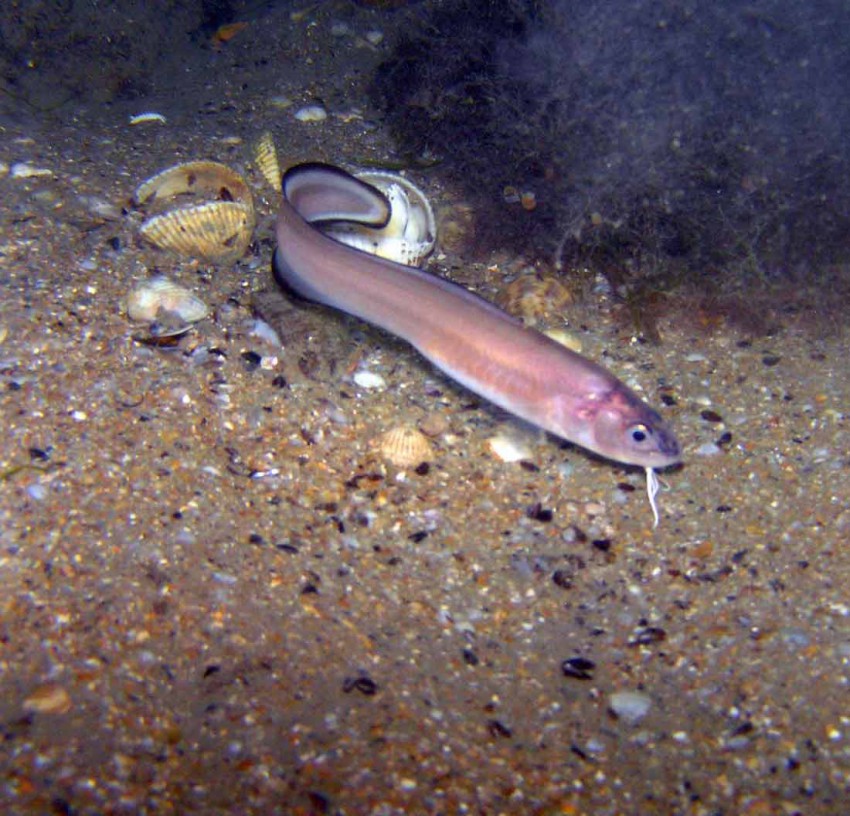 Редкий вид, характерное черное окаймление по оперению хвостика. Тело угревидное, вообще живчик такой, мало того, что он червяка проглотил (вместе с крючком) чуть не до самой попы, он еще и меня норовил за палец тяпнуть. Снял экстрактором и отпустил. В Крыму вродь до полукилограма растет, а этот маленький совсем.