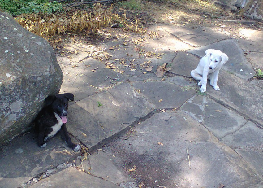 Сегодня при посещении скульптурной композиции «Мацеста» И.Я. Гуслевой около нее обнаружены два щенка: беленький и черненький. Матери рядом нет, видно что голодные (ждут еду от посетителей и пытаются есть траву). Похоже кто-то подбросил.