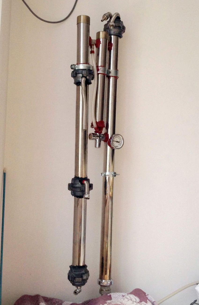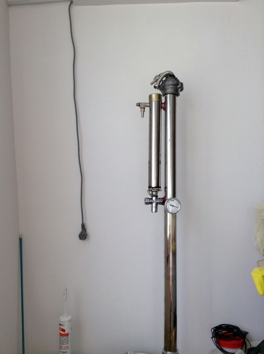 Вот эта труба, больше метра высоты и есть ректификационная колонна. Сверху видны две трубки- это верхний холодильник для создания «дождя» из капель на наполнитель. Рядом трубка- еще одна преграда, ( вместо трехлитровой банки у обычных аппаратов) которые сливаются в колонну около градусника- там соединение с краником и прозрачная трубка измерения уровня наполнения ее отравой.
