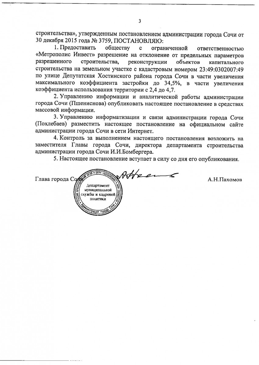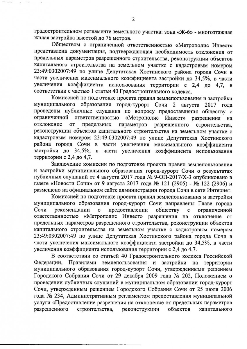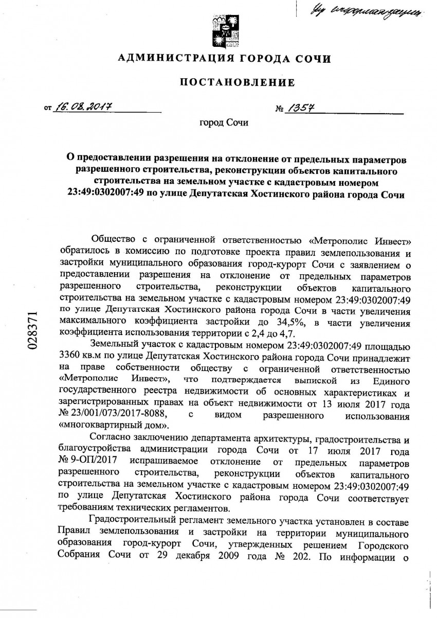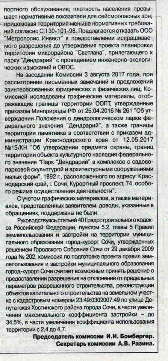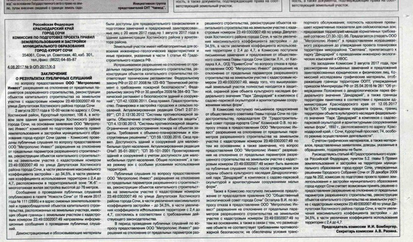 По информации приближённого и достоверного источника в СНП готовится обращение в прокуратуру от Сочинского национального парка. Участок ООО «Метрополис Инвест» с кадастровым номером 23:49:0302007:49 площадью 3360 кв.м. по ул. Депутатской полностью находится в защитной, охранной зоне Объекта культурного наследия федерального значения «Парк «Дендрарий». Но это не помеха для тех кто принимает решения.