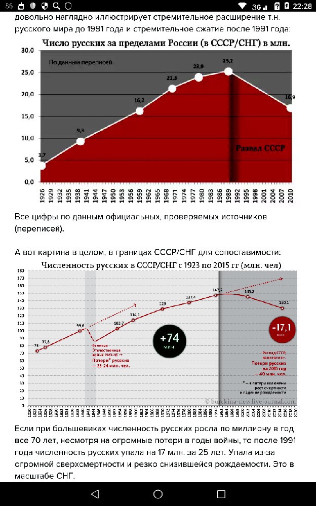 Несмотря на времена так называемого «красного террора» и самой страшной войны 1941-1945 годов — численность основного населения в стране за 70 лет выросла более чем ВДВОЕ — с 73 до 147 миллионов человек, а после ельцынского контрреволюционного переворота 1991-1993 годов страна потеряла 17-20 миллионов государствообразующего населения, это ли не геноцид по планам от Даллеса до Чубайса: "подумаешь, вымрет тридцать миллионов!.."