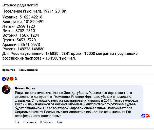 Ельцинский Майдан в 1991 году с отменой СССР и кровавый вооруженный госпереворот 1993 г. имели следствием натуральный геноцид: официальные данные подтверждают убыль населения в бывших республиках СССР, это наглядно также и в России — если не считать присоединение Крыма и еще 10 миллионов мигрантов, получивших российские паспорта, то от полутораста миллионов в 1991 году к нынешнему времени основное население сократилось на полтора десятка миллионов человек — то есть на 10 %, фактически больше