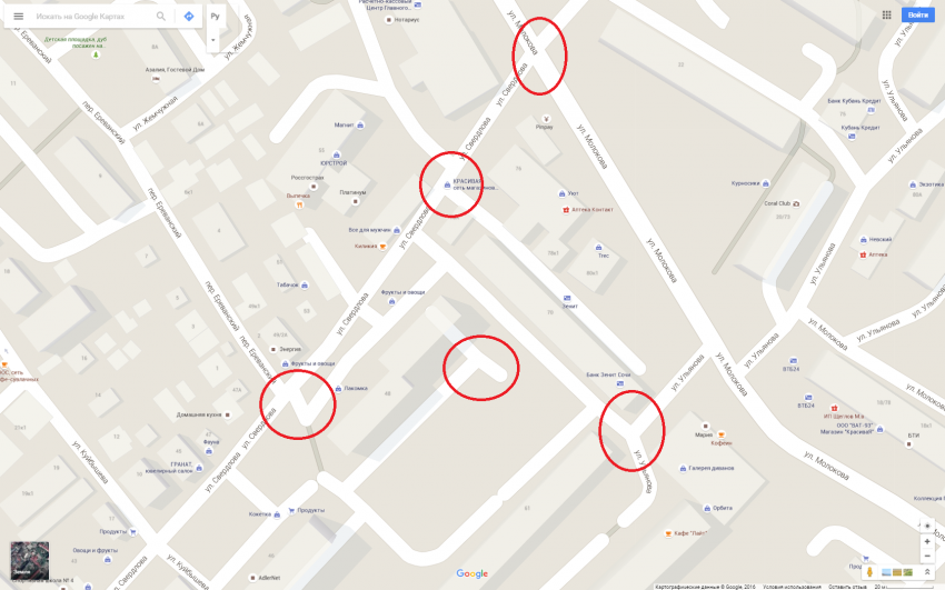 ДВСуток всем, ищу хулигана, проходившего по ул.Свердлова 46 кинувшего умышленно в машину бутылку, интересует может кто нибудь с Адлера помочь камерами видео-наблюдения за 12.07.16 в отмеченных областях на скриншоте карты.