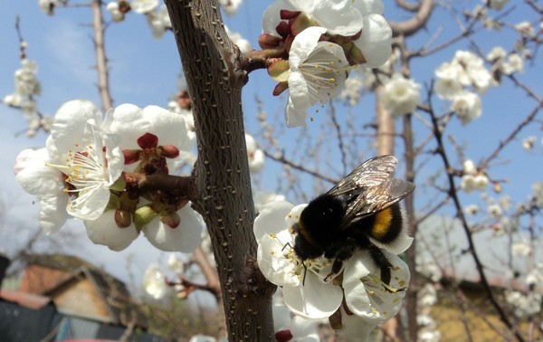 Вам и всем приветовцам такой вот шмель-трудяга на цветущем абрикосе для весеннего настроения в последний день зимы