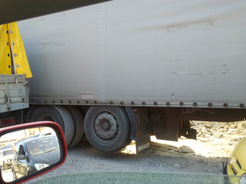 Вид из машины справа(у обочины припаркована фура, а параллельно ей ещё и ГАзель)