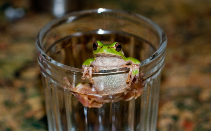 Вышел сын на крыльцо, увидел это чудо, занес в дом, показать, а лягушонок прыг в стакан, и получилась фотосессия.