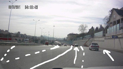 И чего здесь сложного? Знак одностороннее движение и предписывающий на две полосы, разясняет что движение только прямо а не на мост а внизу уже движение прямо на виноградную и на лево на Донскую.Фотографу с его регистратором надо правила выучить.