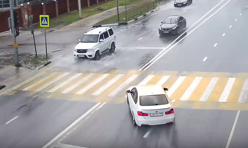 Аквапланирование вот причина, хозяин БМВ за резиной не смотрел проморгал полицейскую метку.Вот и спланировал.