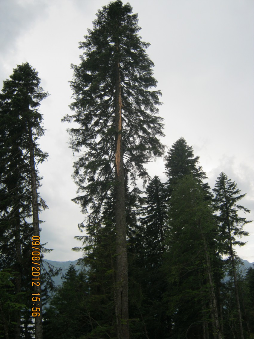 Итог недавнего удара молнии… С макушки до середины пихты ствол разорван, практически, до сердцевины. Не конец света, но, скорее всего, конец пихты.